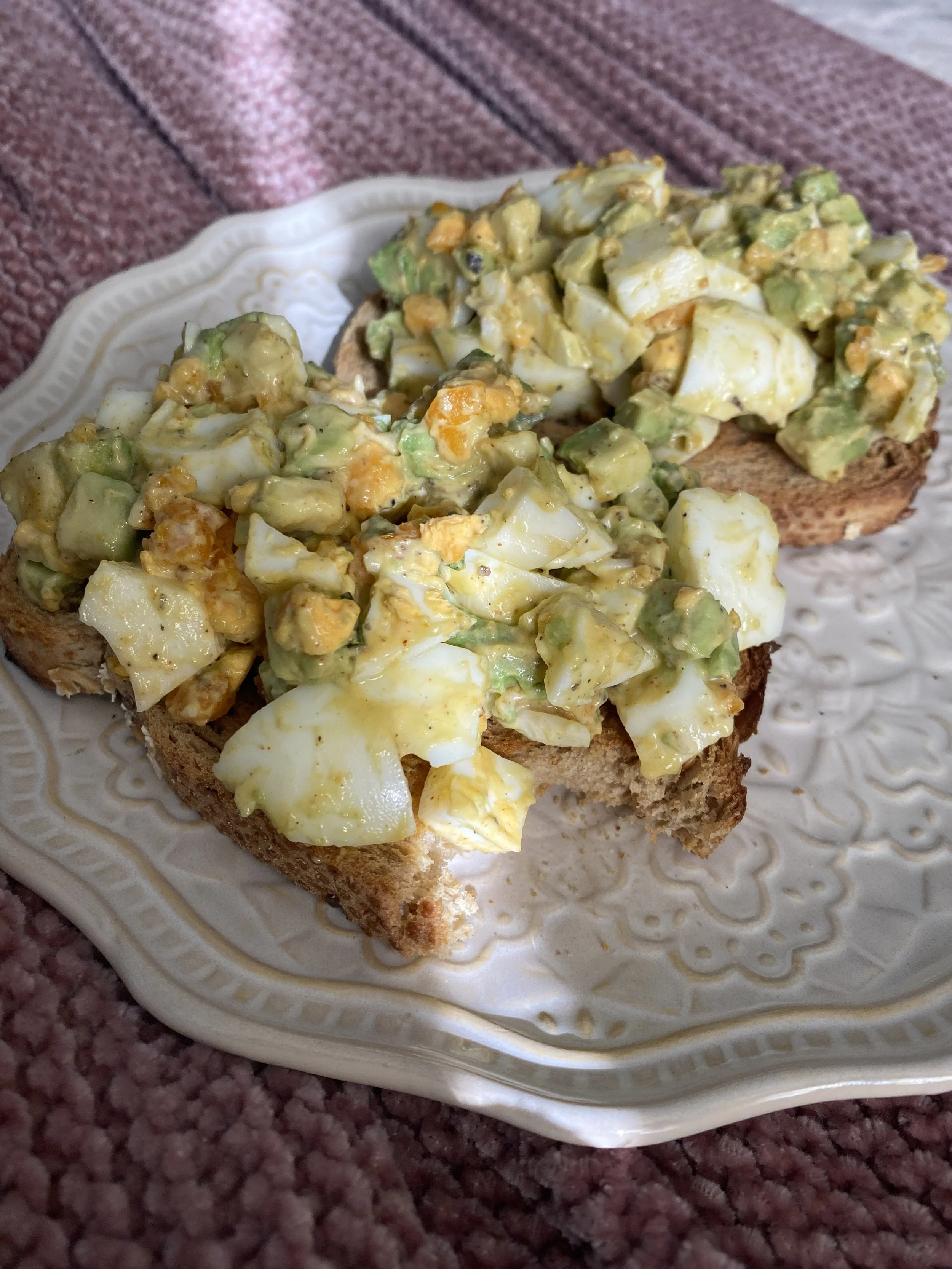 If you are looking to meal-prep the Egg Salad sandwich fully, you could do so for 2-3 days. Simply boil 4-6 eggs, use 1-2 avocados, and use twice as many add-ins. It will need to be stored in an airtight container in the fridge to ensure that the eggs do not go bad and the avocado does not turn brown. In the morning, simply toast up your bread and dollop on your egg salad!